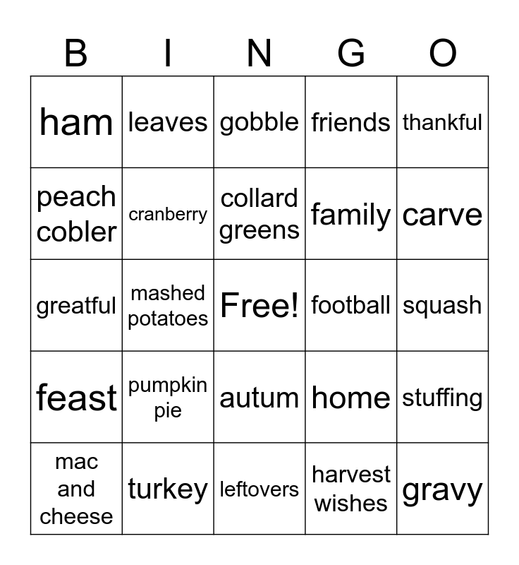This bingo card has a free space and 24 words: pumpkin pie, turkey, collard greens, mac and cheese, thankful, ham, peach cobler, leaves, football, autum, family, greatful, home, stuffing, cranberry, harvest wishes, squash, gobble, carve, mashed potatoes, gravy, feast, friends and leftovers.
