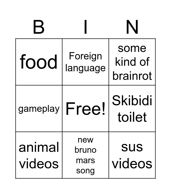 This bingo card has a free space and 8 words: Skibidi toilet, some kind of brainrot, Foreign language, animal videos, food, sus videos, gameplay and new bruno mars song.