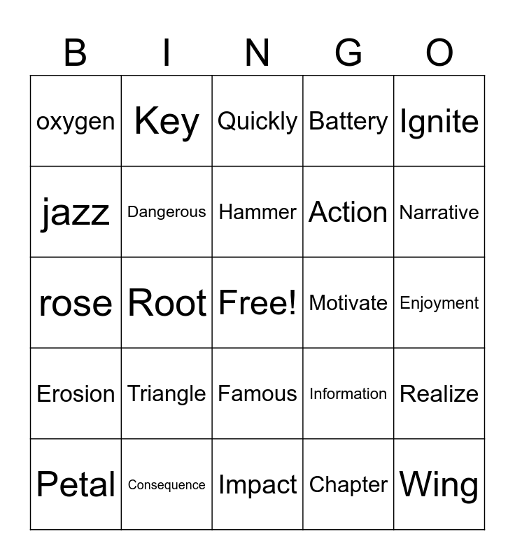 This bingo card has a free space and 24 words: Petal, Triangle, Hammer, Chapter, Ignite, oxygen, Key, Quickly, Motivate, Enjoyment, rose, Dangerous, Information, Realize, jazz, Consequence, Impact, Battery, Narrative, Erosion, Root, Famous, Action and Wing.