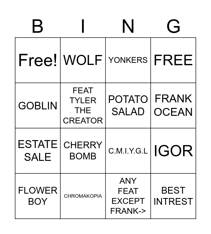This bingo card has 16 words: FLOWER BOY, CHROMAKOPIA, YONKERS, FREE, GOBLIN, WOLF, C.M.I.Y.G.L, IGOR, Free!, FEAT TYLER THE CREATOR, ANY FEAT EXCEPT FRANK->, FRANK OCEAN, ESTATE SALE, CHERRY BOMB, POTATO SALAD and BEST INTREST.