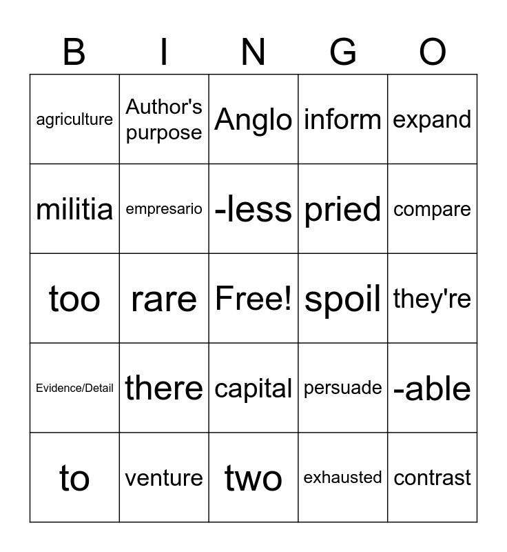 This bingo card has a free space and 29 words: to, survey, rare, their, agriculture, Anglo, empresario, there, spoil, venture, they're, contrast, two, exhausted, compare, prosperity, capital, Evidence/Detail, expand, too, persuade, thriving, pried, militia, inform, Author's purpose, -able, -less and -ous.