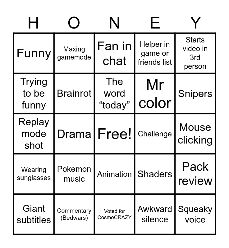 This bingo card has a free space and 24 words: Pokemon music, Commentary (Bedwars), The word “today”, Giant subtitles, Starts video in 3rd person, Funny, Trying to be funny, Maxing gamemode, Challenge, Animation, Mr color, Replay mode shot, Shaders, Pack review, Brainrot, Awkward silence, Mouse clicking, Fan in chat, Snipers, Drama, Squeaky voice, Wearing sunglasses, Helper in game or friends list and Voted for CosmoCRAZY.