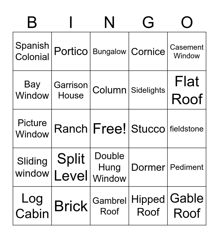 This bingo card has a free space and 29 words: Log Cabin, Cape Cod, Ranch, Georgian, Spanish Colonial, Bungalow, Garrison House, Split Level, Stucco, Brick, fieldstone, Gable Roof, Gambrel Roof, Hipped Roof, Flat Roof, Mansard Roof, Double Hung Window, Sliding window, Casement Window, Picture Window, Dormer, Fanlight, Sidelights, Bay Window, Cornice, Portico, Pediment, Column and Chimney.