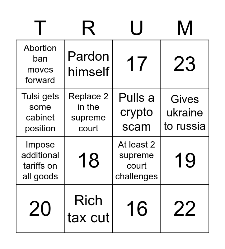 This bingo card has 25 words: TSLA to $1000, Trump claims best economy by the end of 2025, Gives ukraine to russia, rfk health appointment backfire, Tulsi gets some cabinet position, Abortion ban moves forward, Replace 2 in the supreme court, Pardon himself, Rich tax cut, Massive government firing, Impose additional tariffs on all goods, At least 2 supreme court challenges, Rolls back environmental regulations, Prices of goods increases including gas, Pulls a crypto scam, Major change to education system, 16, 17, 18, 19, 20, 21, 22, 23 and 24.