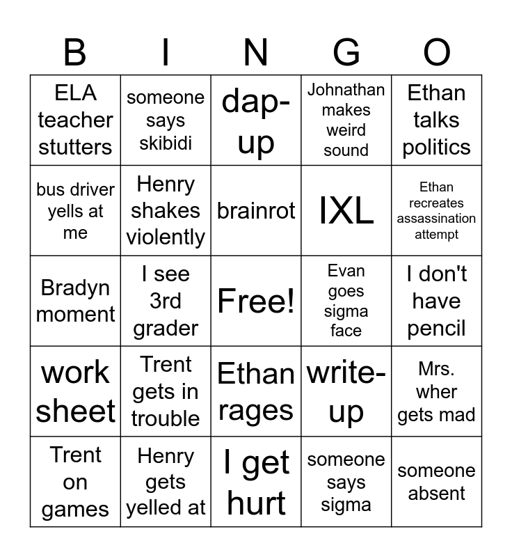 This bingo card has a free space and 24 words: Trent gets in trouble, Henry gets yelled at, brainrot, Trent on games, Ethan talks politics, ELA teacher stutters, bus driver yells at me, someone says skibidi, Evan goes sigma face, Ethan rages, IXL, Bradyn moment, write-up, Mrs. wher gets mad, Henry shakes violently, someone says sigma, I don't have pencil, dap-up, Ethan recreates assassination attempt, I see 3rd grader, someone absent, work sheet, Johnathan makes weird sound and I get hurt.