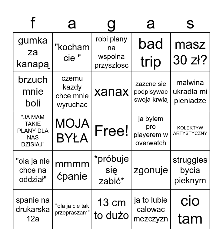 This bingo card has a free space and 24 words: mmmm ćpanie, "ola ja cie tak przepraszam", xanax, spanie na drukarska 12a, masz 30 zł?, gumka za kanapą, brzuch mnie boli, "kocham cie ", ja bylem pro playerem w overwatch, *próbuje się zabić*, zazcne sie podpisywac swoja krwią, "JA MAM TAKIE PLANY DLA NAS DZISIAJ", zgonuje, struggles bycia pieknym, czemu kazdy chce mnie wyruchac, ja to lubie calowac mezczyzn, KOLEKTYW ARTYSTYCZNY, robi plany na wspolna przyszlosc, malwina ukradla mi pieniadze, MOJA BYŁA, cio tam, "ola ja nie chce na oddział", bad trip and 13 cm to dużo.