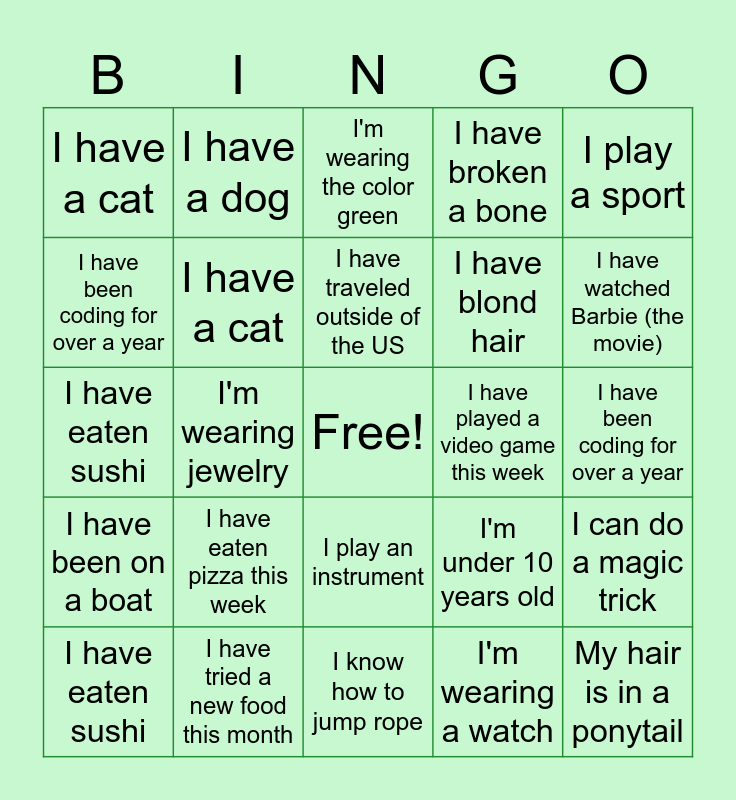 ⚠ This card has duplicate items: I wear glasses (2), I'm wearing a hat (2), I'm wearing the color green (2), I'm wearing the color red (2), I was not born in MA (2), I'm over 10 years old (2), I have blue eyes (2), I have brown eyes (2), I'm under 10 years old (2), I have watched Barbie (the movie) (2), I have blond hair (2), I have brown/black hair (2), I have traveled outside of the US (2), I have been coding for over a year (2), I'm wearing a watch (2), I'm wearing jewelry (2), I have a middle name (2), My hair is in a ponytail (2), I did all my homework for tomorrow (2), I play a sport (2), I have been to a concert (2), I have eaten sushi (2), I have a cat (2), I have a dog (2), I have broken a bone (2)