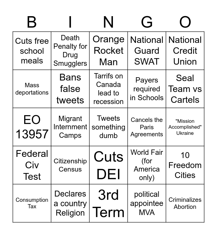 This bingo card has a free space and 24 words: Citizenship Census, Declares a country Religion, Tarrifs on Canada lead to recession, Consumption Tax, National Credit Union, Cuts free school meals, Mass deportations, Death Penalty for Drug Smugglers, Cancels the Paris Agreements, Cuts DEI, Payers required in Schools, EO 13957, World Fair (for America only), 10 Freedom Cities, Bans false tweets, political appointee MVA, "Mission Accomplished" Ukraine, Orange Rocket Man, Seal Team vs Cartels, Migrant Internment Camps, Criminalizes Abortion, Federal Civ Test, National Guard SWAT and 3rd Term.