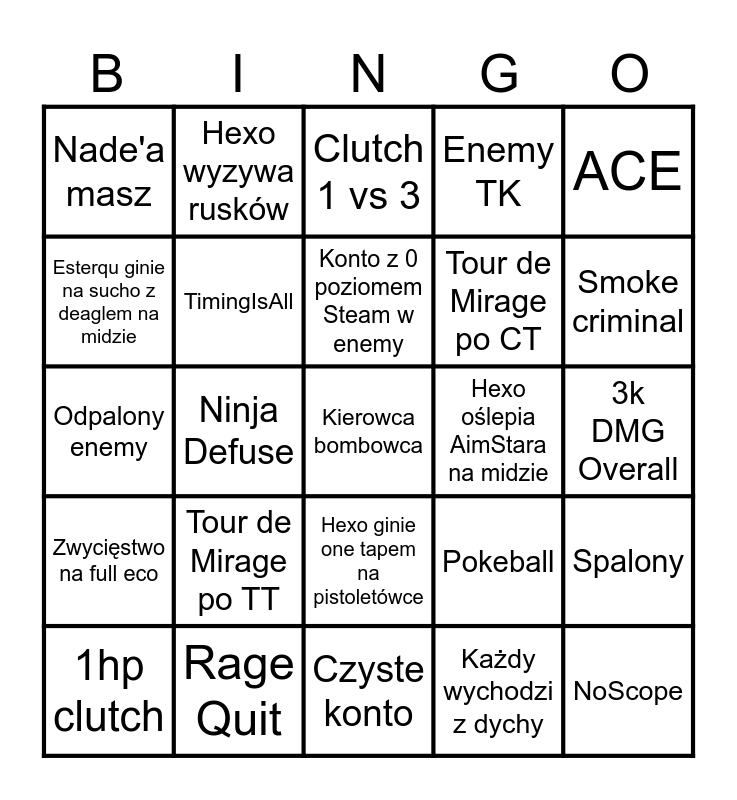 This bingo card has a free space and 24 words: Tour de Mirage po TT, Rage Quit, Konto z 0 poziomem Steam w enemy, 1hp clutch, ACE, Nade'a masz, Esterqu ginie na sucho z deaglem na midzie, Hexo wyzywa rusków, Hexo oślepia AimStara na midzie, Hexo ginie one tapem na pistoletówce, Tour de Mirage po CT, Odpalony enemy, Pokeball, Spalony, TimingIsAll, Każdy wychodzi z dychy, 3k DMG Overall, Clutch 1 vs 3, Smoke criminal, Ninja Defuse, NoScope, Zwycięstwo na full eco, Enemy TK and Czyste konto.