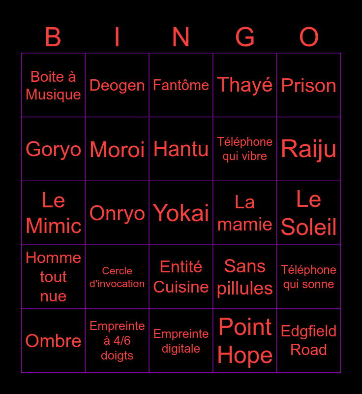 This bingo card has a free space and 74 words: Esprit, Spectre, Fantôme, Poltergeist, Banshee, Djinn, Cauchemar, Revenant, Ombre, Démon, Yurei, Oni, Hantu, Goryo, Myling, Onryo, Les Jumeaux, Raiju, Obake, Le Mimic, Moroi, Deogen, Thayé, Tanglewood Drive, Edgfield Road, Ridgeview Court, Grafton Farmhouse, Bleasdale Farmhouse, Willow Street, Brownstone Highschool, Prison, Maple Lodge Campsite, Camp Woodwind, Sunny Meadows, Sunny Meadows Restricted, Point Hope, Cage Thoracique, Colone Vertébrale, Crâne, Ecriture livre, Empreinte digitale, Empreinte à 4/6 doigts, Empreinte de pas, Poupée Vaudou, Planche Ouija, Boite à Musique, Miroire Hanté, Cercle d'invocation, Carte de Tarot, Patte de singe, Prêtresse, Le Pendu, Le Soleil, La Lune, Entité garage, Entité Cave, Entité Cuisine, Entité Salon, Cri dans le microphone, Téléphone qui sonne, Téléphone qui vibre, Rire enfant, Homme tout nue, Sadako, La mamie, D.O.T.S, Photo de l'entité, Sans encens, Sans pillules, Compléter les objectifs secondaires, Game parfaites, Jet du poltergeist, Cri de la banshee and Cri du deogen à la spirit box.