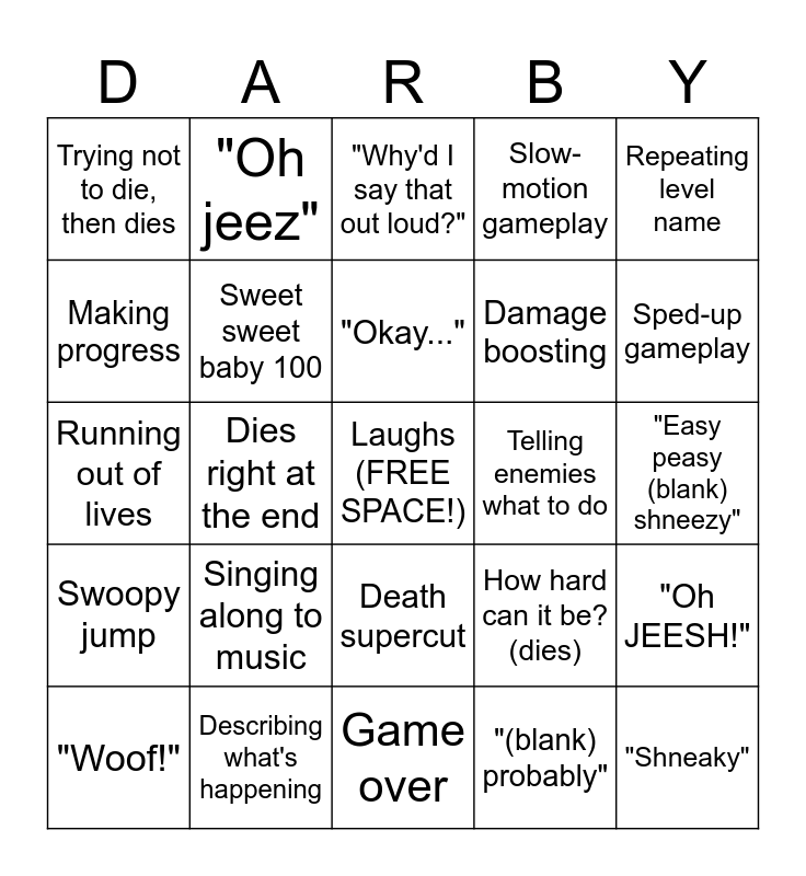 This bingo card has a free space and 24 words: Singing along to music, Describing what's happening, "Okay...", "Woof!", Repeating level name, Trying not to die, then dies, Making progress, "Oh jeez", Telling enemies what to do, Death supercut, Damage boosting, Running out of lives, How hard can it be? (dies), "Oh JEESH!", Sweet sweet baby 100, "(blank) probably", "Easy peasy (blank) shneezy", "Why'd I say that out loud?", Sped-up gameplay, Dies right at the end, "Shneaky", Swoopy jump, Slow-motion gameplay and Game over.