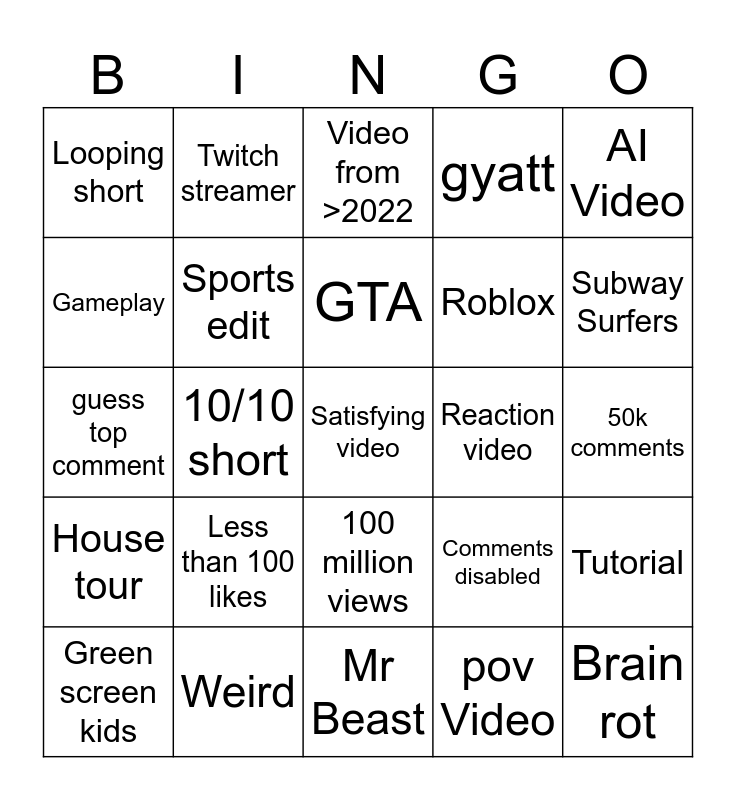 This bingo card has a free space and 24 words: Less than 100 likes, Weird, GTA, Green screen kids, AI Video, Looping short, Gameplay, Twitch streamer, Reaction video, 100 million views, Roblox, guess top comment, Comments disabled, Tutorial, Sports edit, pov Video, 50k comments, Video from >2022, Subway Surfers, 10/10 short, Brain rot, House tour, gyatt and Mr Beast.