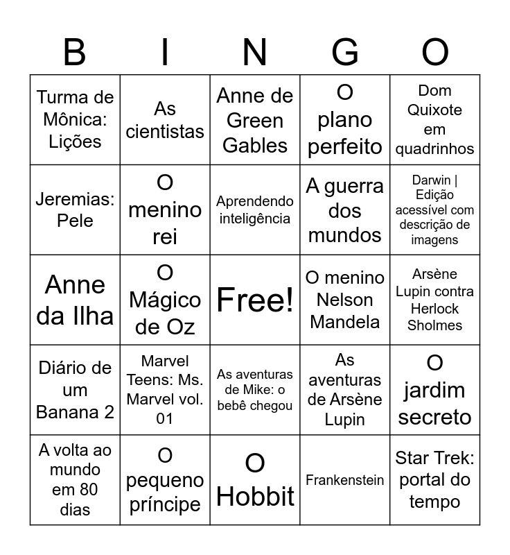 This bingo card has a free space and 54 words: Diário de um Banana, Diário de um Banana 2, Diário de um Banana 3, As aventuras de Mike, As aventuras de Mike: o bebê chegou, As aventuras de Mike: mudando de casa, O plano perfeito, O mistério dos 3 R's, Jeremias: Pele, Turma de Mônica: Laços, Turma de Mônica: Lições, Uma viagem do Brasil ao Japão, O pequeno príncipe, A volta ao mundo em 80 dias, Vinte mil léguas submarinas, O Hobbit, Star Trek: portal do tempo, A guerra dos mundos, Viagem ao Centro da Terra, Arsène Lupin contra Herlock Sholmes, As aventuras de Arsène Lupin, Animais inventores, O menino Nelson Mandela, Dom Quixote em quadrinhos, O diário de uma princesa desastrada, As cientistas, Peter Pan, Entregas expressas da Kiki, Histórias de Ninar para Garotas Rebeldes, Frankenstein, Somos todos Greta, A história da mitologia para quem tem pressa, A caçadora de árvores, Esperança para voar, Anne de Green Gables, Anne de Avonlea, Anne da Ilha, O jardim secreto, Grandes gregos, O menino rei, Como fazíamos sem..., A divina comédia em quadrinhos, Simbad, o marujo, Miles Morales: Ondas de Choque, Marvel Teens: Ms. Marvel vol. 01, De volta aos sonhos, De volta aos quinze, O homem estranho da casa ao lado, Aprendendo inteligência, O Mágico de Oz, Darwin | Edição acessível com descrição de imagens, A rainha dos estapafúrdios, Vamos pensar também sobre valores? and O Guia dos Curiosos.