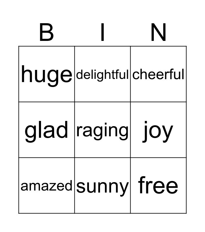 This bingo card has a free space and 8 words: joy, cheerful, delightful, amazed, huge, free, glad and sunny.