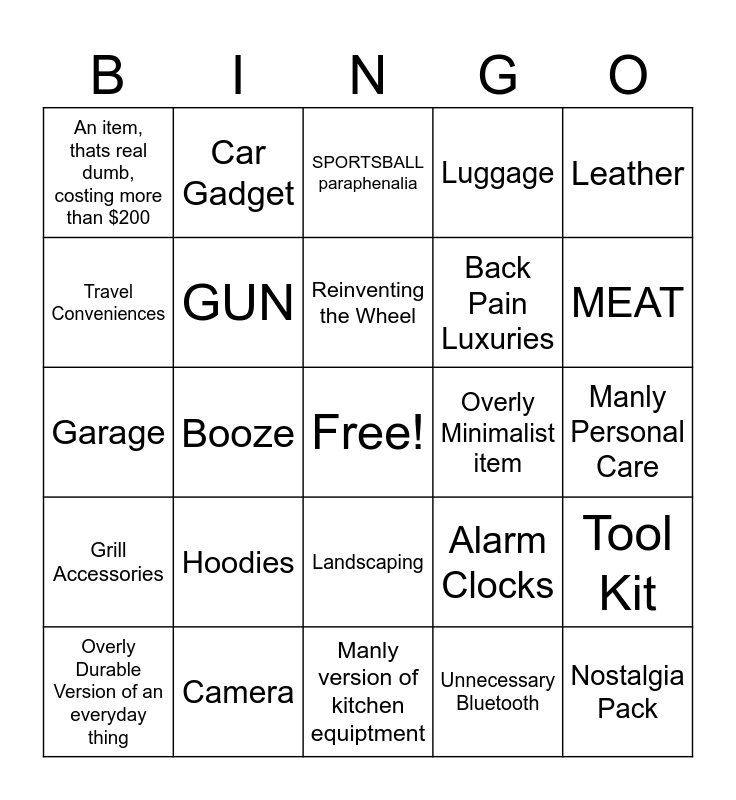 This bingo card has a free space and 54 words: Military Wannabe Paraphenalia, Grill Accessories, GOLF, Whiskey Stones, Landscaping, Booze Containment Devices, Luggage, "Smoked", Travel Conveniences, Bath Accessories, An item, thats real dumb, costing more than $200, Car Comfort, Camera, Overly Durable Version of an everyday thing, Knives, Manly version of kitchen equiptment, Nostalgia Pack, Back Pain Luxuries, Power tools, Manly Personal Care, Alarm Clocks, Organizer (Not tool kit), Overly Minimalist item, Leather, Man Smells (Sandalwood, Car Gadget, Shaving, DRONE/ RC, Bluetooth Speaker, Unnecessary Bluetooth, Mini Fridge/Cooler, Coffee/Tea, Bad Acquired Tastes, Watches, SPORTSBALL paraphenalia, Tie paraphenalia, Garage, Tool Kit, Camping Equipment, GUN, Magnets, "For Men", Paranoia, Weird 2 in 1, Hoodies, Sneakers, Coffee Table Books, Why would you give this as a gift?, Reinventing the Wheel, Booze, MEAT, FIRE, Another Goddamned Wallet and Airtag.