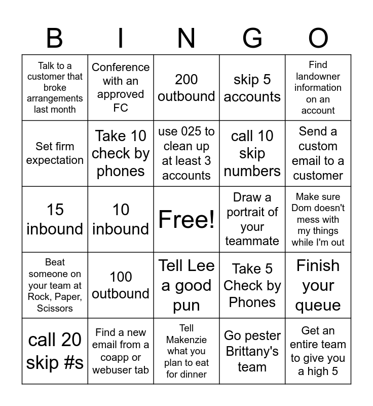 This bingo card has a free space and 24 words: 100 outbound, Find a new email from a coapp or webuser tab, use 025 to clean up at least 3 accounts, call 20 skip #s, Find landowner information on an account, Talk to a customer that broke arrangements last month, Set firm expectation, Conference with an approved FC, Draw a portrait of your teammate, Tell Lee a good pun, call 10 skip numbers, 15 inbound, Take 5 Check by Phones, Finish your queue, Take 10 check by phones, Go pester Brittany's team, Make sure Dom doesn't mess with my things while I'm out, 200 outbound, Send a custom email to a customer, 10 inbound, Get an entire team to give you a high 5, Beat someone on your team at Rock, Paper, Scissors, skip 5 accounts and Tell Makenzie what you plan to eat for dinner.