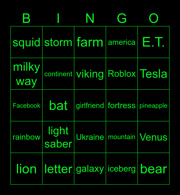 This bingo card has a free space and 24 words: light saber, letter, viking, lion, E.T., squid, milky way, storm, fortress, Ukraine, Roblox, Facebook, mountain, Venus, continent, iceberg, pineapple, farm, Tesla, bat, bear, rainbow, america and galaxy.