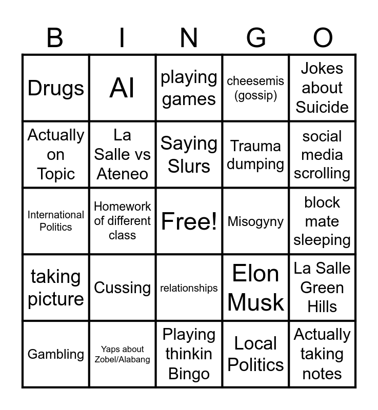 This bingo card has a free space and 24 words: Cussing, Yaps about Zobel/Alabang, Saying Slurs, Gambling, Jokes about Suicide, Drugs, Actually on Topic, AI, Misogyny, relationships, Trauma dumping, International Politics, Elon Musk, La Salle Green Hills, La Salle vs Ateneo, Local Politics, block mate sleeping, playing games, social media scrolling, Homework of different class, Actually taking notes, taking picture, cheesemis (gossip) and Playing thinkin Bingo.