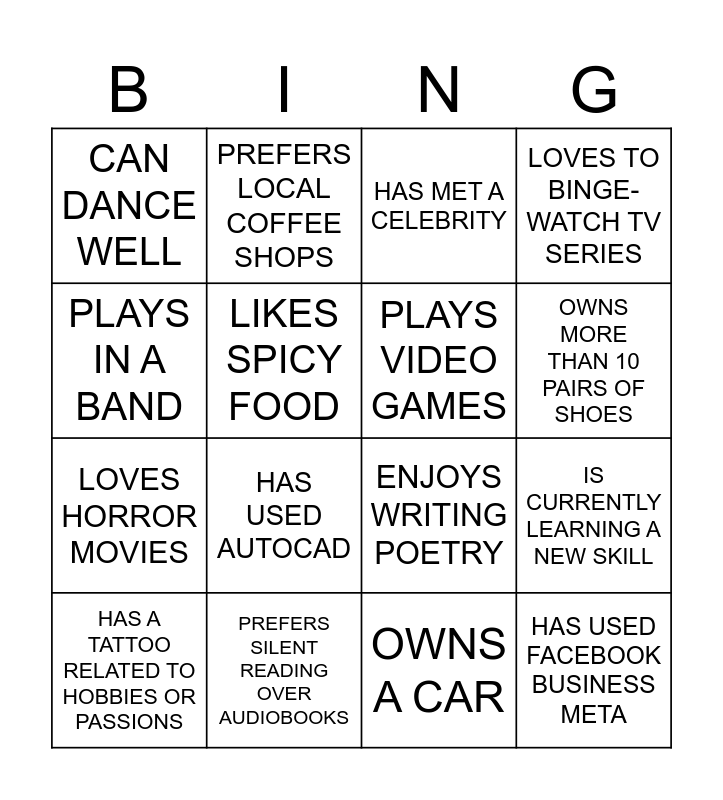 This bingo card has 16 words: PREFERS SILENT READING OVER AUDIOBOOKS, IS CURRENTLY LEARNING A NEW SKILL, HAS MET A CELEBRITY, CAN DANCE WELL, LOVES HORROR MOVIES, PREFERS LOCAL COFFEE SHOPS, ENJOYS WRITING POETRY, OWNS A CAR, PLAYS IN A BAND, LIKES SPICY FOOD, HAS A TATTOO RELATED TO HOBBIES OR PASSIONS, LOVES TO BINGE-WATCH TV SERIES, HAS USED AUTOCAD, OWNS MORE THAN 10 PAIRS OF SHOES, PLAYS VIDEO GAMES and HAS USED FACEBOOK BUSINESS META.