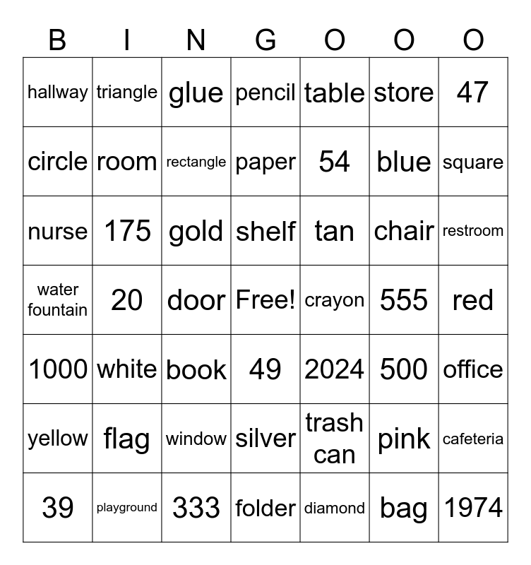 This bingo card has a free space and 48 words: 1000, 20, 333, 49, 54, 555, 47, 39, 175, door, pencil, table, chair, restroom, water fountain, flag, glue, shelf, trash can, store, square, circle, triangle, rectangle, diamond, blue, red, yellow, white, gold, silver, tan, pink, cafeteria, hallway, playground, book, folder, crayon, bag, office, nurse, room, window, paper, 2024, 500 and 1974.