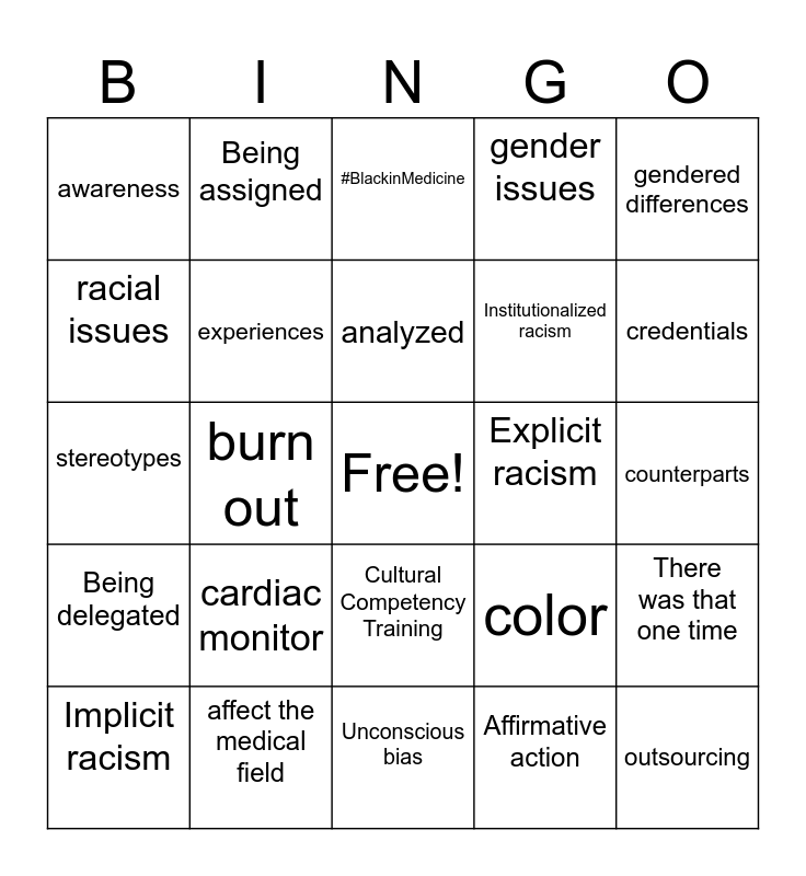 This bingo card has a free space and 28 words: There was that one time, Internalized racism, Institutionalized racism, Affirmative action, racial issues, #BlackinMedicine, Being assigned, Being delegated, Explicit racism, Implicit racism, stereotypes, gender issues, affect the medical field, Unconscious bias, credentials, emergency room technician, cardiac monitor, experiences, analyzed, Cultural Competency Training, awareness, sticky floor, outsourcing, burn out, counterparts, color, gendered differences and deep seated.