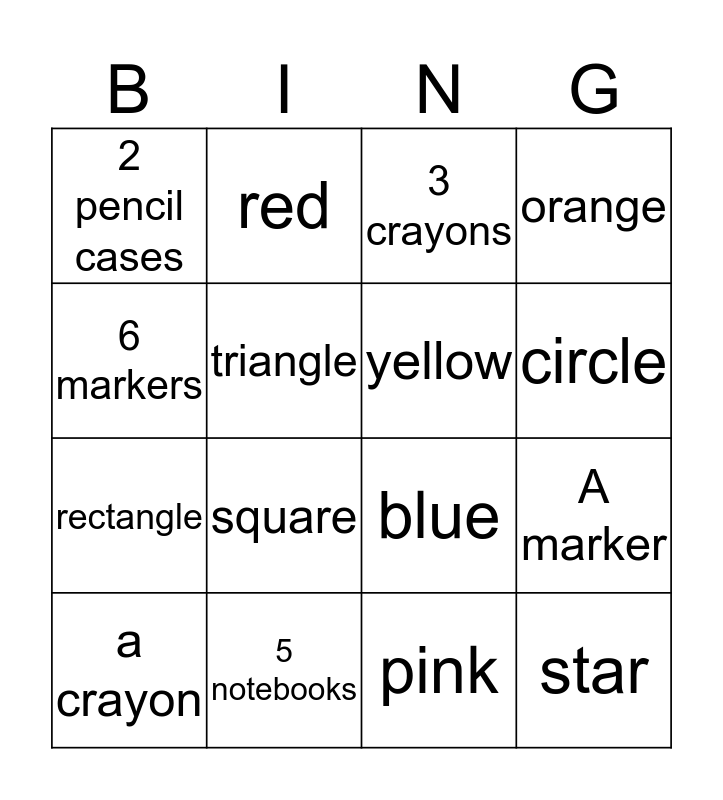 This bingo card has a free space and 20 words: A marker, A pencil case, 3 crayons, a notebook, a crayon, 6 markers, 5 notebooks, 2 pencil cases, rectangle, red, square, star, triangle, oval, yellow, heart, circle, orange, pink and green.