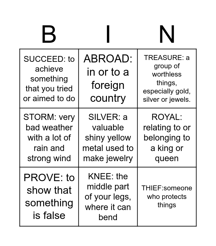 This bingo card has a free space and 8 words: ROYAL: relating to or belonging to a king or queen, TREASURE: a group of worthless things, especially gold, silver or jewels., ABROAD: in or to a foreign country, PROVE: to show that something is false, SUCCEED: to achieve something that you tried or aimed to do, THIEF:someone who protects things, STORM: very bad weather with a lot of rain and strong wind and KNEE: the middle part of your legs, where it can bend.
