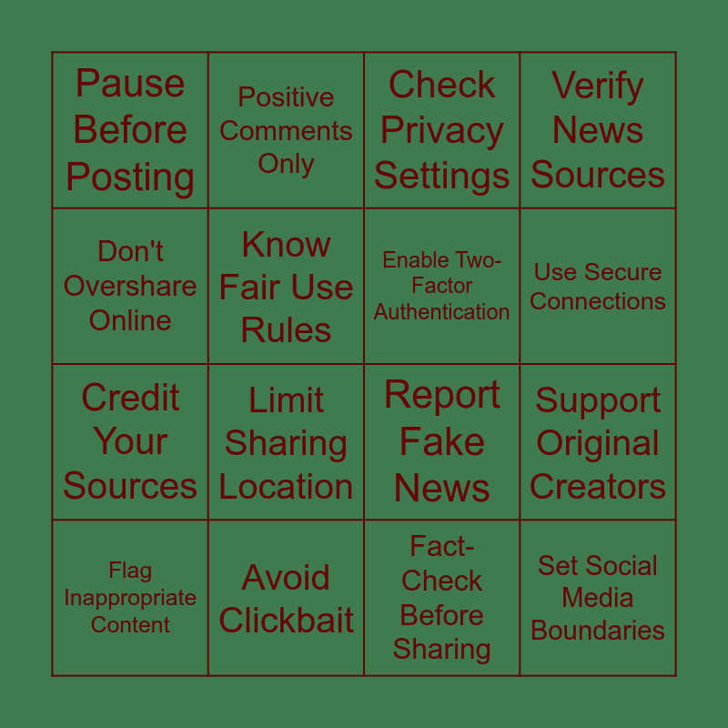This bingo card has 16 words: Avoid Clickbait, Support Original Creators, Check Privacy Settings, Pause Before Posting, Credit Your Sources, Positive Comments Only, Report Fake News, Fact-Check Before Sharing, Don't Overshare Online, Know Fair Use Rules, Flag Inappropriate Content, Verify News Sources, Limit Sharing Location, Use Secure Connections, Enable Two-Factor Authentication and Set Social Media Boundaries.