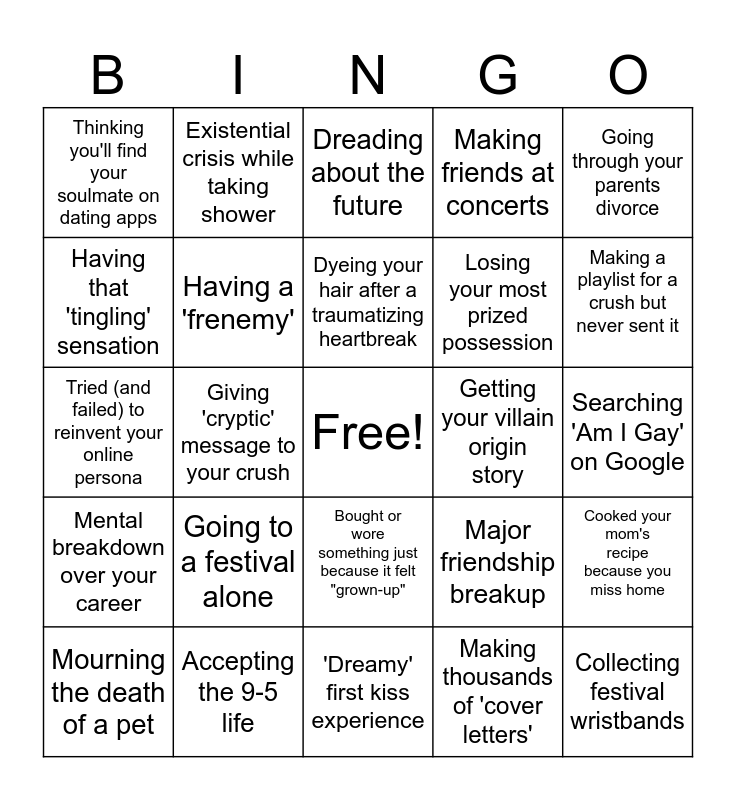 This bingo card has a free space and 24 words: Going to a festival alone, Accepting the 9-5 life, Dyeing your hair after a traumatizing heartbreak, Mourning the death of a pet, Going through your parents divorce, Thinking you'll find your soulmate on dating apps, Having that 'tingling' sensation, Existential crisis while taking shower, Getting your villain origin story, Bought or wore something just because it felt "grown-up", Losing your most prized possession, Tried (and failed) to reinvent your online persona, Major friendship breakup, Cooked your mom's recipe because you miss home, Having a 'frenemy', Making thousands of 'cover letters', Searching 'Am I Gay' on Google, Dreading about the future, Making a playlist for a crush but never sent it, Giving 'cryptic' message to your crush, Collecting festival wristbands, Mental breakdown over your career, Making friends at concerts and 'Dreamy' first kiss experience.
