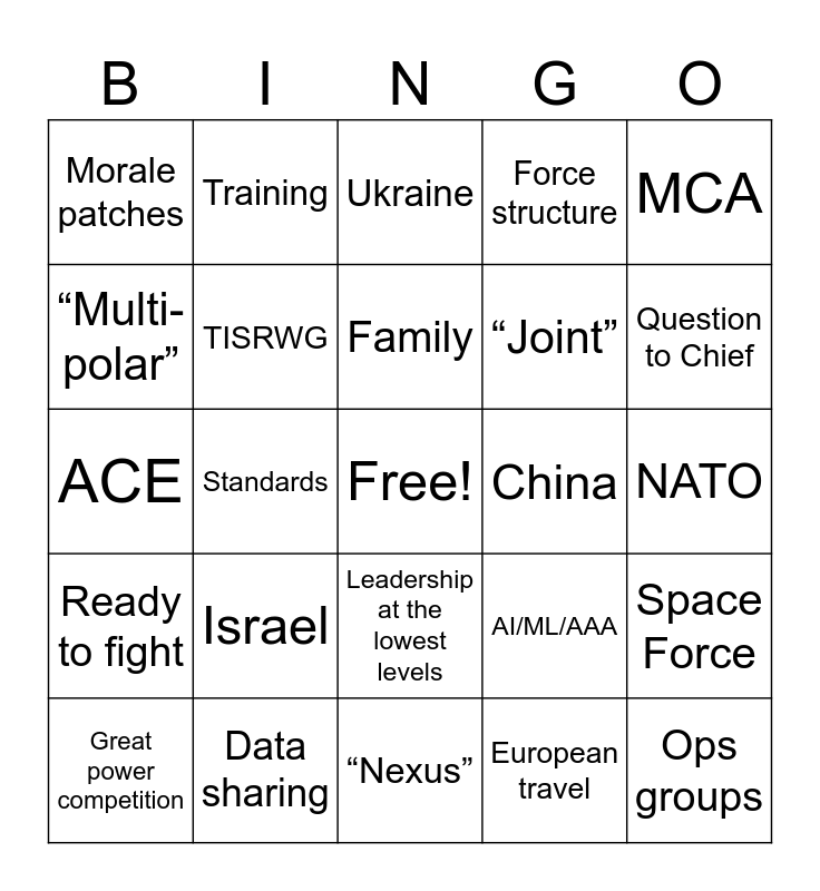 This bingo card has a free space and 29 words: Great power competition, Back to the “basics”, Standards, Election, Morale patches, Ukraine, TISRWG, Israel, China, Data sharing, NATO, Ops groups, “Nexus”, European travel, Question to Chief, 5th Gen Fighters, Leadership at the lowest levels, Ready to fight, MCA, ACE, AI/ML/AAA, DDIL, “Joint”, “Multi-polar”, Force structure, Training, Space Force, Family and Holidays.