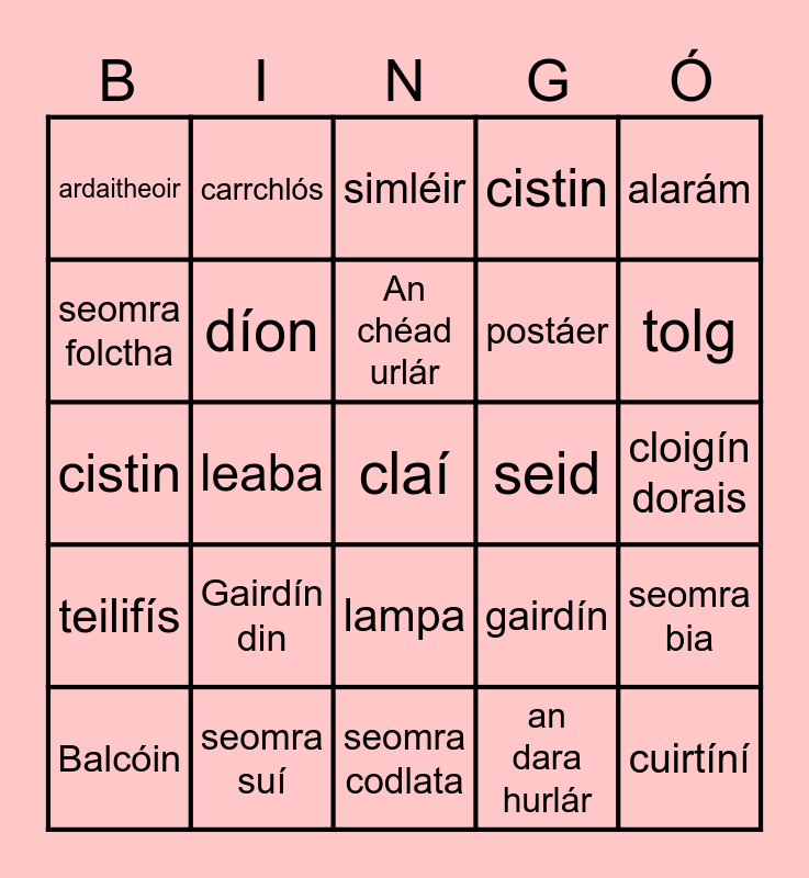 This bingo card has a free space and 24 words: Balcóin, Gairdín din, An chéad urlár, an dara hurlár, alarám, ardaitheoir, carrchlós, simléir, seid, cloigín dorais, cistin, díon, gairdín, seomra bia, seomra folctha, seomra suí, seomra codlata, cistin, tolg, teilifís, leaba, lampa, postáer and cuirtíní.
