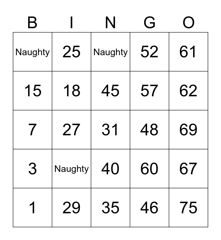This bingo card has 29 words: 1, 16, 31, 46, 61, 15, 25, 35, 48, 75, 7, 18, Naughty, 60, 69, 9, 27, 40, 52, 67, 3, 29, 45, 57, 62, Naughty, Naughty, Naughty and Naughty.