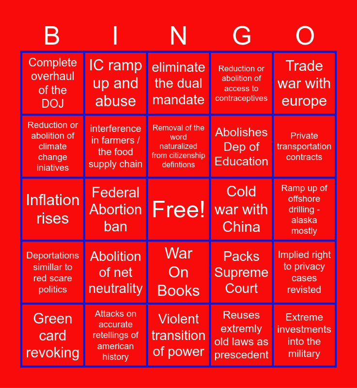 This bingo card has a free space and 24 words: Abolition of net neutrality, Attacks on accurate retellings of american history, Removal of the word naturalized from citizenship defintions, Green card revoking, Trade war with europe, Complete overhaul of the DOJ, Reduction or abolition of climate change iniatives, IC ramp up and abuse, Cold war with China, War On Books, Abolishes Dep of Education, Inflation rises, Packs Supreme Court, Implied right to privacy cases revisted, interference in farmers / the food supply chain, Reuses extremly old laws as prescedent, Ramp up of offshore drilling - alaska mostly, eliminate the dual mandate, Private transportation contracts, Federal Abortion ban, Extreme investments into the military, Deportations simillar to red scare politics, Reduction or abolition of access to contraceptives and Violent transition of power.