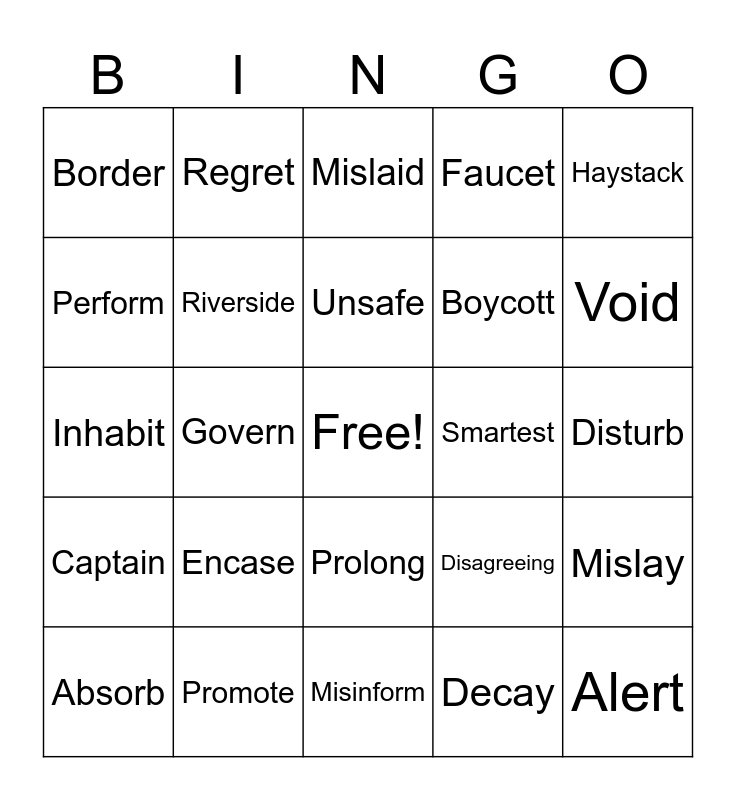 This bingo card has a free space and 267 words: Pathway, Waist, Mainland, Maintain, Midday, Rapid, Flashback, Haystack, Milkman, Railway, Cabin, Claim, Pigtail, Midway, Madman, Misfit, Dash, Abstract, Mainsail, Misplay, Addict, Mishap, Disband, Disclaim, Mislay, Mint, Distract, Admit, Display, Miscast, Aim, Abstain, Dismay, Distant, Misprint, Backspin, Audit, Candid, Fault, Cause, Captain, Waistband, Timid, Mainstay, Vault, Fraud, Strain, Victim, Valid, Gaunt, Grandstand, Insist, Commit, Imprint, Camp, Inlaid, Consist, Contrast, Inhabit, Dim, Convict, Instant, Implant, Complain, Impact, Cash, Distinct, Command, Mislaid, Canvas, Impair, Infant, Curtail, Birthday, Turn, Auto, Astronaut, Random, Launch, Verdict, Vitamin, Blackbird, Turban, Whirlwind, Pattern, Server, Taunt, Prefer, Restrict, Complaint, Prohibit, Betray, Detail, Insert, Cotton, Reclaim, Decay, Disturb, Prepay, Restrain, Beyond, District, Proclaim, Absurd, Prison, Preplan, Defraud, Confirm, Blizzard, Haunt, Holiday, Mermaid, Modern, Transport, Northern, Cargo, Hardship, Garland, Cavern, Overhaul, Backyard, Border, Partnership, Unfit, Preprogram, Obtain, Alarm, Perform, Repay, Uncommon, Depart, Prolong, Absorb, Discard, Unafraid, Permit, Impart, Persist, Portray, Alert, Misinform, Discomfort, Prefix, Apart, Riverside, Costume, Landscape, Stampede, Maximum, Microscope, Launder, Murmur, Borderline, Tornado, Husband, Autumn, Backbone, Handshake, Obsolete, Misbehave, Provide, Minimum, Record, Entertain, Exact, Combine, Restart, Reconstruct, Unaware, Exclude, Invalid, Impolite, Promote, Encase, Prescribe, Readjust, Unsafe, Conclude, Umpire, Extreme, Turmoil, Corduroy, Homeland, Corrode, Void, Forlorn, Barter, Poison, Boycott, Asteroid, Oyster, Stubborn, Pauper, Govern, Hoist, Hopelessness, Explaining, Incomplete, Employed, Economic, Relaxing, Happiness, Admire, Carelessness, Classic, Dominates, Mistakes, Disrupt, Plastic, Rejoined, Predict, Destroyed, Fantastic, Softness, Propose, Completeness, Splendid, Airspeed, Female, Forget, Textile, Membership, Freedom, Forest, Canteen, Benefit, Leftover, Homemade, Fifteenth, Landlord, Evergreen, Novelist, Punishing, Vanish, Astonishing, Unselfish, Explode, Optimism, Florist, Consume, Disagreeing, Smartest, Heroism, Absolute, Misconduct, Pessimism, Humanist, Advertises, Finishing, Interested, Regret, Prevented, Southwestern, Background, Seventeen, Lifeboat, Railroad, Charcoal, Roadside, Electrode, Playground, Faucet, Spellbound, Northwestern, Census, Soundtrack and Greenhouse.