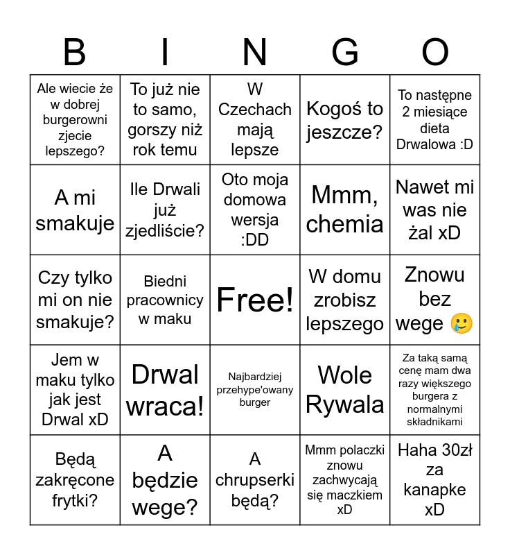 This bingo card has a free space and 24 words: Drwal wraca!, A będzie wege?, Oto moja domowa wersja :DD, Będą zakręcone frytki?, To następne 2 miesiące dieta Drwalowa :D, Ale wiecie że w dobrej burgerowni zjecie lepszego?, A mi smakuje, To już nie to samo, gorszy niż rok temu, W domu zrobisz lepszego, Najbardziej przehype'owany burger, Mmm, chemia, Czy tylko mi on nie smakuje?, Wole Rywala, Za taką samą cenę mam dwa razy większego burgera z normalnymi składnikami, Ile Drwali już zjedliście?, Mmm polaczki znowu zachwycają się maczkiem xD, Znowu bez wege 🥲, W Czechach mają lepsze, Nawet mi was nie żal xD, Biedni pracownicy w maku, Haha 30zł za kanapke xD, Jem w maku tylko jak jest Drwal xD, Kogoś to jeszcze? and A chrupserki będą?.