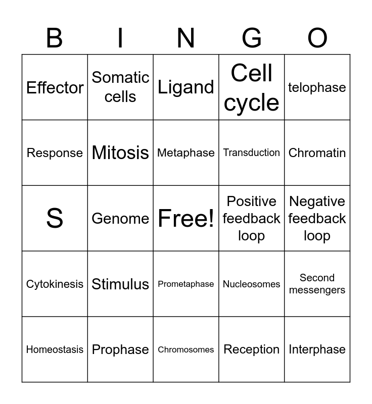 This bingo card has a free space and 40 words: G1, S, G2, Mitosis, Prophase, Prometaphase, Metaphase, Anaphase, telophase, Cytokinesis, Genome, Cell cycle, Interphase, Negative feedback loop, Positive feedback loop, Stimulus, Receptor/sensor, Effector, Response, Ligand, Second messengers, Reception, Transduction, Response, Direct contact cell communication, Local signaling, Paracrine signaling, Synaptic signaling, Long distance signaling, intercellular, receptor, Homeostasis, Histones, Nucleosomes, Chromatin, Chromosomes, Centromere, Kinetochore, Somatic cells and Gametes.