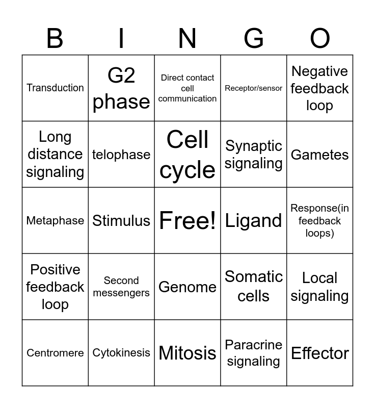 This bingo card has a free space and 40 words: Prometaphase, Metaphase, Anaphase, telophase, Cytokinesis, Genome, Cell cycle, Interphase, Negative feedback loop, Positive feedback loop, Stimulus, Receptor/sensor, Effector, Response(in feedback loops), Ligand, Second messengers, Reception, Transduction, Response(signaling pathway), Direct contact cell communication, Local signaling, Paracrine signaling, Synaptic signaling, Long distance signaling, intercellular, receptor, Homeostasis, Histones, Nucleosomes, Chromatin, Chromosomes, Centromere, Kinetochore, Somatic cells, Gametes, Mitosis, G1 phase, S phase, G2 phase and Prophase.