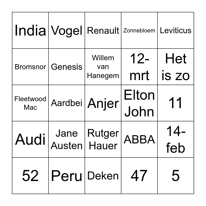 This bingo card has 55 words: 2019, 52, 2-feb, India, Deken, Ferrari, Genesis, 2,50, 12-mrt, Exodus, Zonnebloem, 1, God met ons, 1989, Japan, Pannenkoek, Leviticus, Aardbei, 50, Anjer, Elton John, 14, ABBA, Renault, 199, Willem van Hanegem, 47, Maan, 11, 14-feb, Dorus, Volkswagen, Joop Zoetemelk, Koeken, Bromsnor, Fleetwood Mac, 27-apr, Audi, 5, Liverpool, Vogel, Joop Doderer, Miley Cyrus, 1997, Jane Austen, Peru, Frankie Valli, Peugot, Kate Bush, Het is zo, Rotterdam, 13, 11-sep, Rutger Hauer and Parijs.