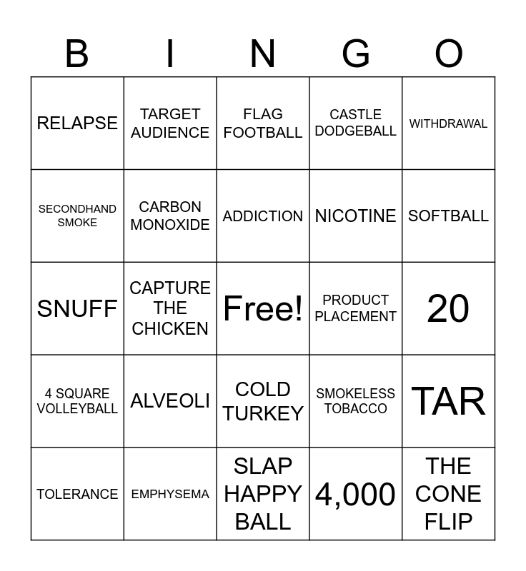 This bingo card has a free space and 24 words: ALVEOLI, EMPHYSEMA, ADDICTION, TOLERANCE, WITHDRAWAL, RELAPSE, SECONDHAND SMOKE, TARGET AUDIENCE, PRODUCT PLACEMENT, COLD TURKEY, NICOTINE, SNUFF, SMOKELESS TOBACCO, TAR, CARBON MONOXIDE, 4,000, 20, FLAG FOOTBALL, SOFTBALL, CAPTURE THE CHICKEN, THE CONE FLIP, 4 SQUARE VOLLEYBALL, CASTLE DODGEBALL and SLAP HAPPY BALL.