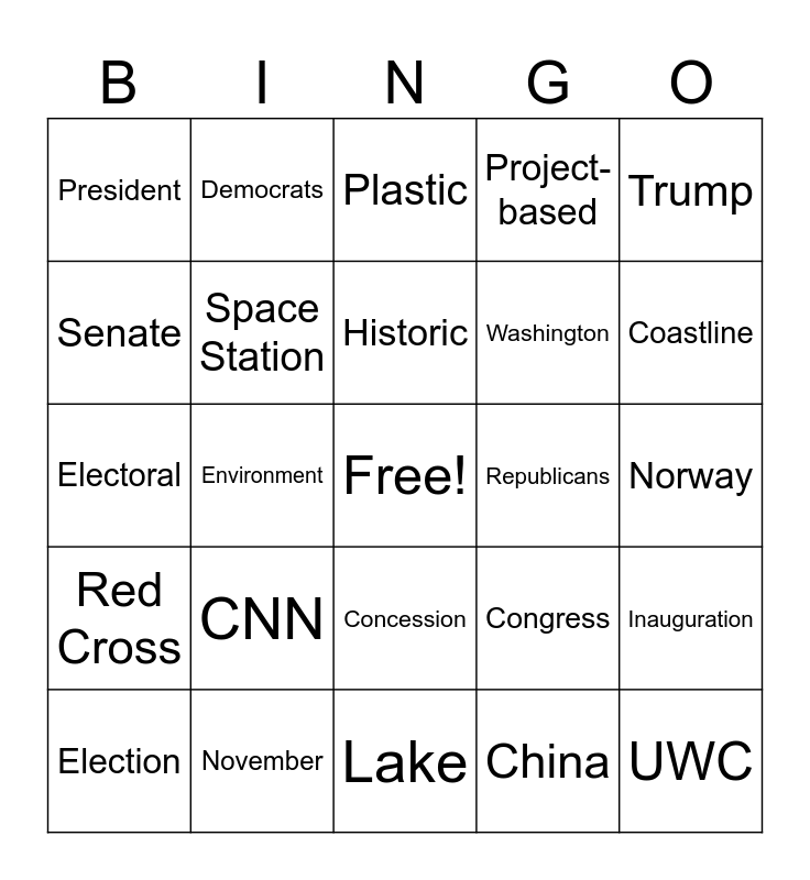 This bingo card has a free space and 24 words: CNN, November, Historic, Election, Trump, President, Senate, Democrats, Republicans, Concession, Washington, Electoral, Congress, Inauguration, Space Station, China, Norway, Plastic, Coastline, Environment, UWC, Red Cross, Project-based and Lake.