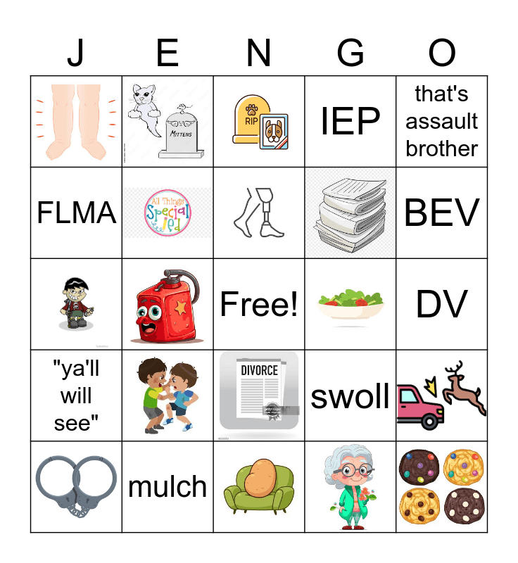 This bingo card has 16 images, a free space and 8 words: mulch, that's assault brother, FLMA, swoll, DV, BEV, "ya'll will see" and IEP.