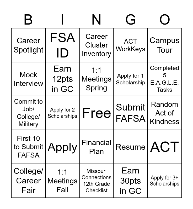 This bingo card has a free space and 24 words: Apply, 1:1 Meetings Fall, 1:1 Meetings Spring, College/ Career Fair, Campus Tour, Career Spotlight, Mock Interview, FSA ID, Submit FAFSA, Financial Plan, Apply for 1 Scholarship, Commit to Job/ College/ Military, Resume, ACT, Earn 12pts in GC, Earn 30pts in GC, Random Act of Kindness, Career Cluster Inventory, Completed 5 E.A.G.L.E. Tasks, Apply for 2 Scholarships, Apply for 3+ Scholarships, First 10 to Submit FAFSA, ACT WorkKeys and Missouri Connections 12th Grade Checklist.