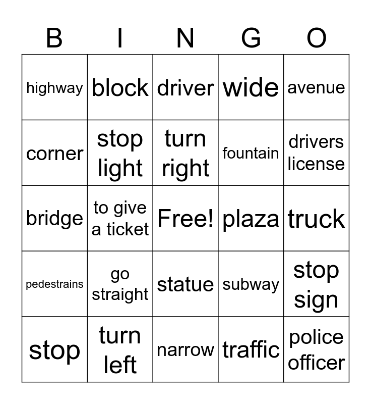 This bingo card has a free space and 24 words: go straight, turn left, turn right, stop, avenue, highway, corner, block, plaza, statue, fountain, bridge, subway, stop sign, stop light, traffic, truck, driver, drivers license, to give a ticket, police officer, pedestrains, wide and narrow.