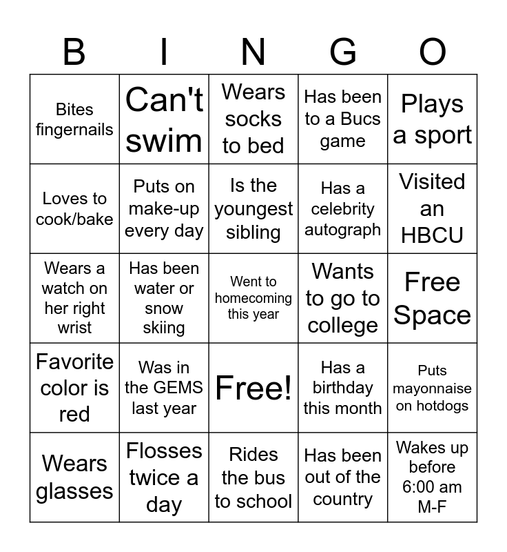 This bingo card has 26 words: Free!, Has been out of the country, Is the youngest sibling, Flosses twice a day, Plays a sport, Bites fingernails, Loves to cook/bake, Can't swim, Free Space, Has a birthday this month, Has a celebrity autograph, Wears a watch on her right wrist, Puts mayonnaise on hotdogs, Wears glasses, Has been water or snow skiing, Loves to read, Has been to a Bucs game, Favorite color is red, Wears socks to bed, Went to homecoming this year, Visited an HBCU, Rides the bus to school, Wants to go to college, Was in the GEMS last year, Puts on make-up every day and Wakes up before 6:00 am M-F.