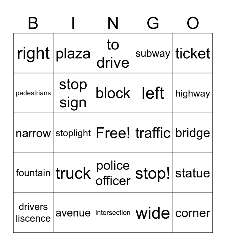 This bingo card has a free space and 24 words: truck, avenue, block, drivers liscence, ticket, right, pedestrians, plaza, traffic, police officer, left, narrow, stop!, statue, stop sign, wide, bridge, to drive, highway, stoplight, corner, fountain, subway and intersection.