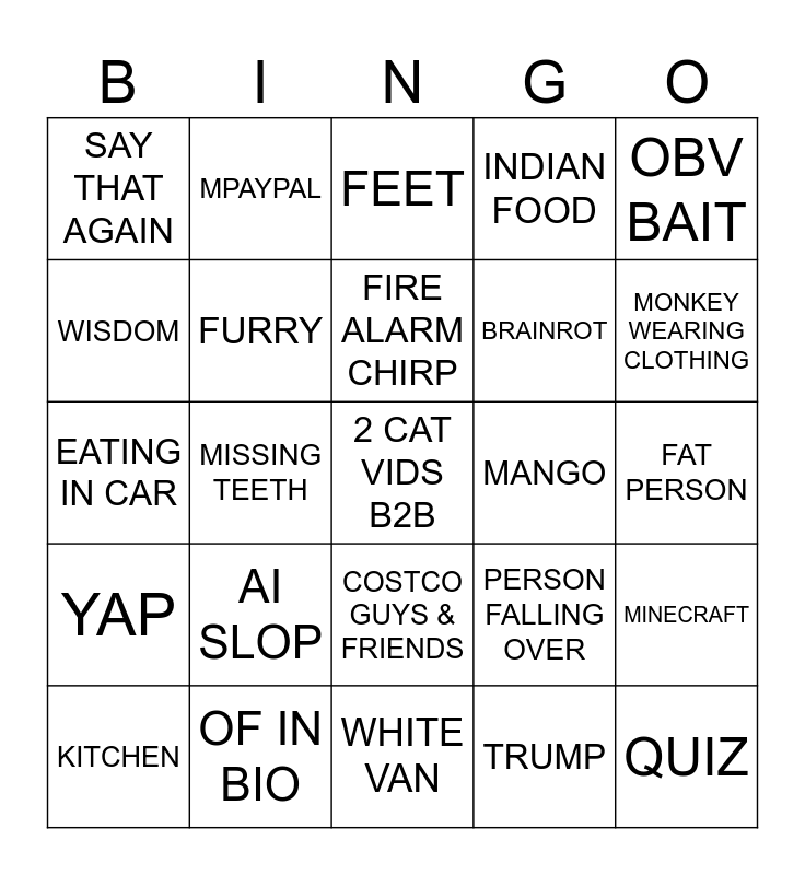 This bingo card has a free space and 24 words: AI SLOP, OF IN BIO, FIRE ALARM CHIRP, KITCHEN, OBV BAIT, SAY THAT AGAIN, WISDOM, MPAYPAL, MANGO, COSTCO GUYS & FRIENDS, BRAINROT, EATING IN CAR, PERSON FALLING OVER, MINECRAFT, FURRY, TRUMP, FAT PERSON, FEET, MONKEY WEARING CLOTHING, MISSING TEETH, QUIZ, YAP, INDIAN FOOD and WHITE VAN.