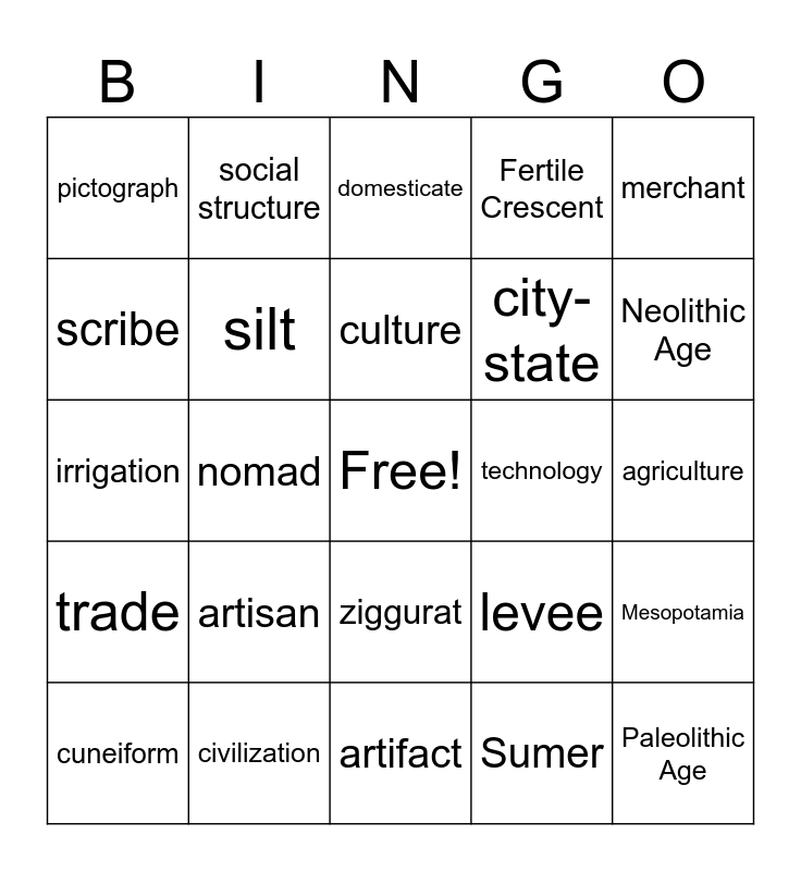 This bingo card has a free space and 24 words: artisan, civilization, culture, cuneiform, merchant, pictograph, scribe, social structure, technology, ziggurat, city-state, irrigation, levee, Mesopotamia, silt, Sumer, agriculture, domesticate, Neolithic Age, nomad, Paleolithic Age, trade, Fertile Crescent and artifact.