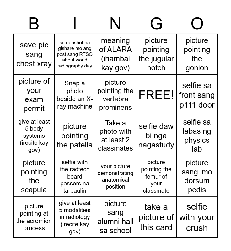 This bingo card has 39 words: Free!, Selfie with Ma'am Angel Caoile, Selfie with 1 RTSO officer, Snap a photo beside an X-ray machine, picture pointing at the acromion process, your picture demonstrating anatomical position, picture pointing the vertebra prominens, selfie ka sa cafeteria, picture pointing the gonion, picture pointing the scapula, picture pointing the patella, picture pointing the jugular notch, Take a photo with at least 2 classmates, selfie sa labas ng physics lab, selfie daw bi nga nagastudy, selfie with the radtech board passers na tarpaulin, picture of any book about radiology, save pic sang chest xray, save pic sang ultrasound machine, picture pointing the femur of your classmate, picture of your exam permit, picture sang alumni hall sa school, FREE!, selfie sa front sang p111 door, save pic sang person nga nakadiscover sang xray, save pic sang first radiograph, selfie with your crush, wacky pic mo, screenshot na nakalike ka sa page sang RTSO, screenshot na gishare mo ang post sang RTSO about world radiography day, screenshot sang radtech dept group chat, picture mo pretending nagapila sa business office, meaning of ALARA (ihambal kay gov), give at least 5 modalities in radiology (irecite kay gov), take a picture of this card, picture sang imo Manus, picture sang imo dorsum pedis, give at least 5 body systems (irecite kay gov) and picture pointing the level of C4.