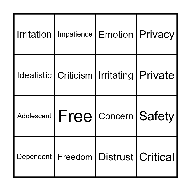 This bingo card has 16 words: Dependent, Freedom, Emotion, Privacy, Idealistic, Impatience, Concern, Safety, Irritation, Criticism, Distrust, Private, Adolescent, Free, Irritating and Critical.