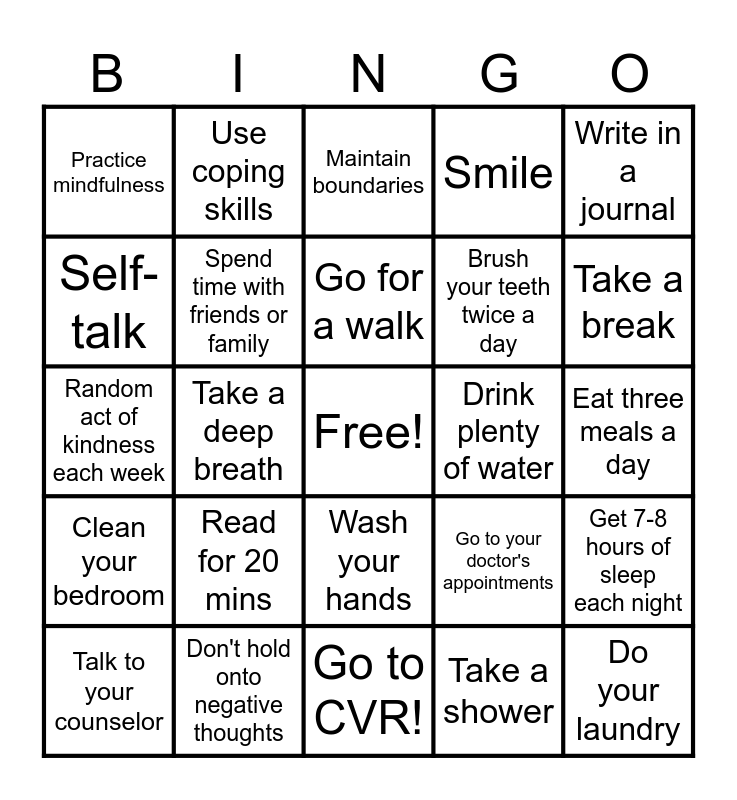 This bingo card has a free space and 24 words: Talk to your counselor, Read for 20 mins, Go for a walk, Take a shower, Write in a journal, Practice mindfulness, Use coping skills, Maintain boundaries, Drink plenty of water, Eat three meals a day, Random act of kindness each week, Spend time with friends or family, Go to your doctor's appointments, Get 7-8 hours of sleep each night, Self-talk, Don't hold onto negative thoughts, Go to CVR!, Smile, Take a break, Clean your bedroom, Take a deep breath, Wash your hands, Brush your teeth twice a day and Do your laundry.